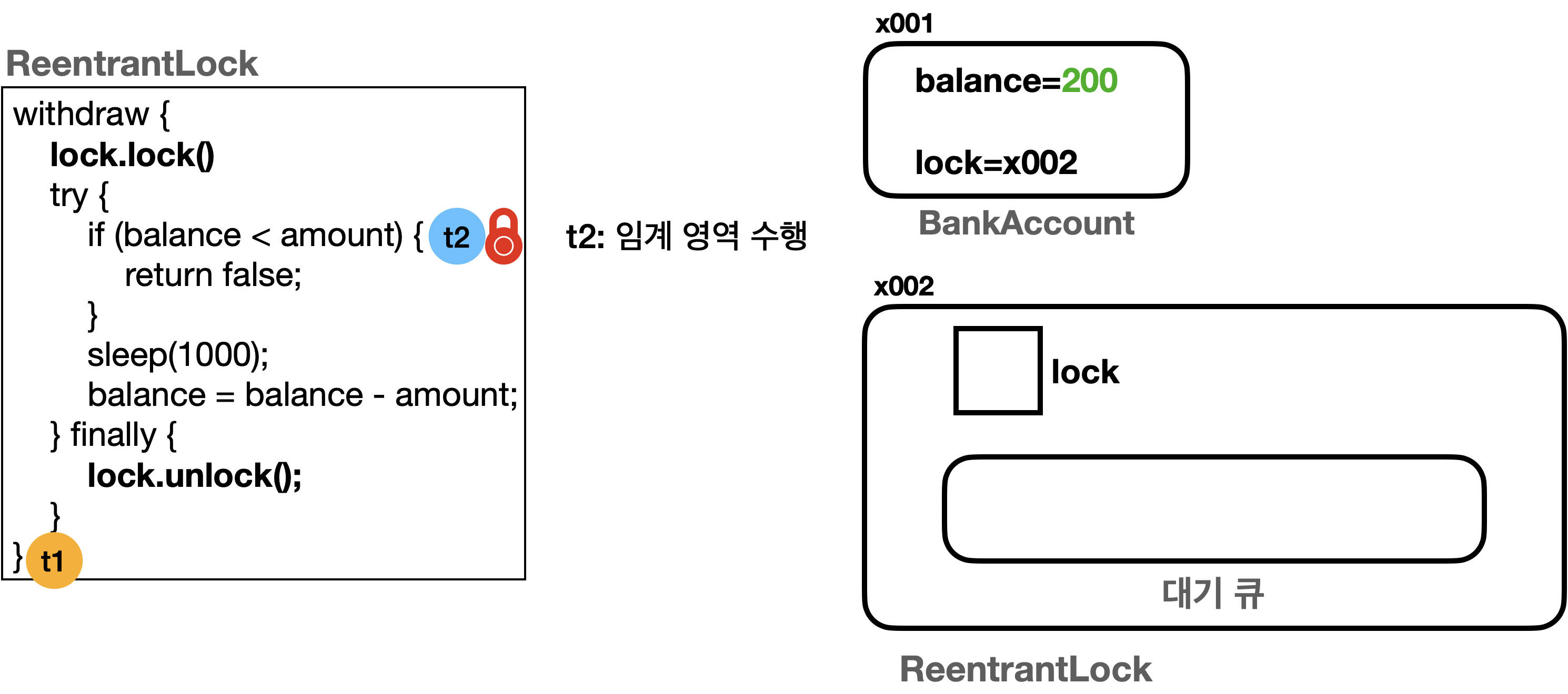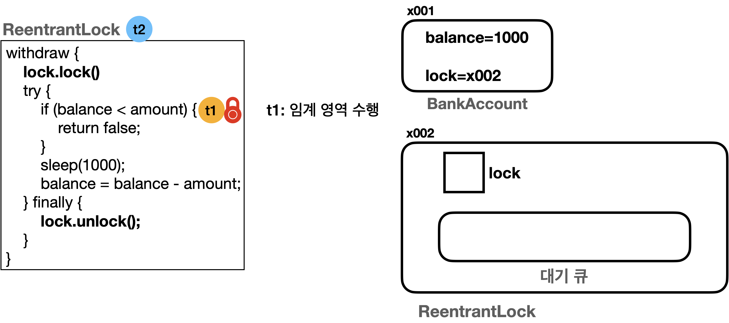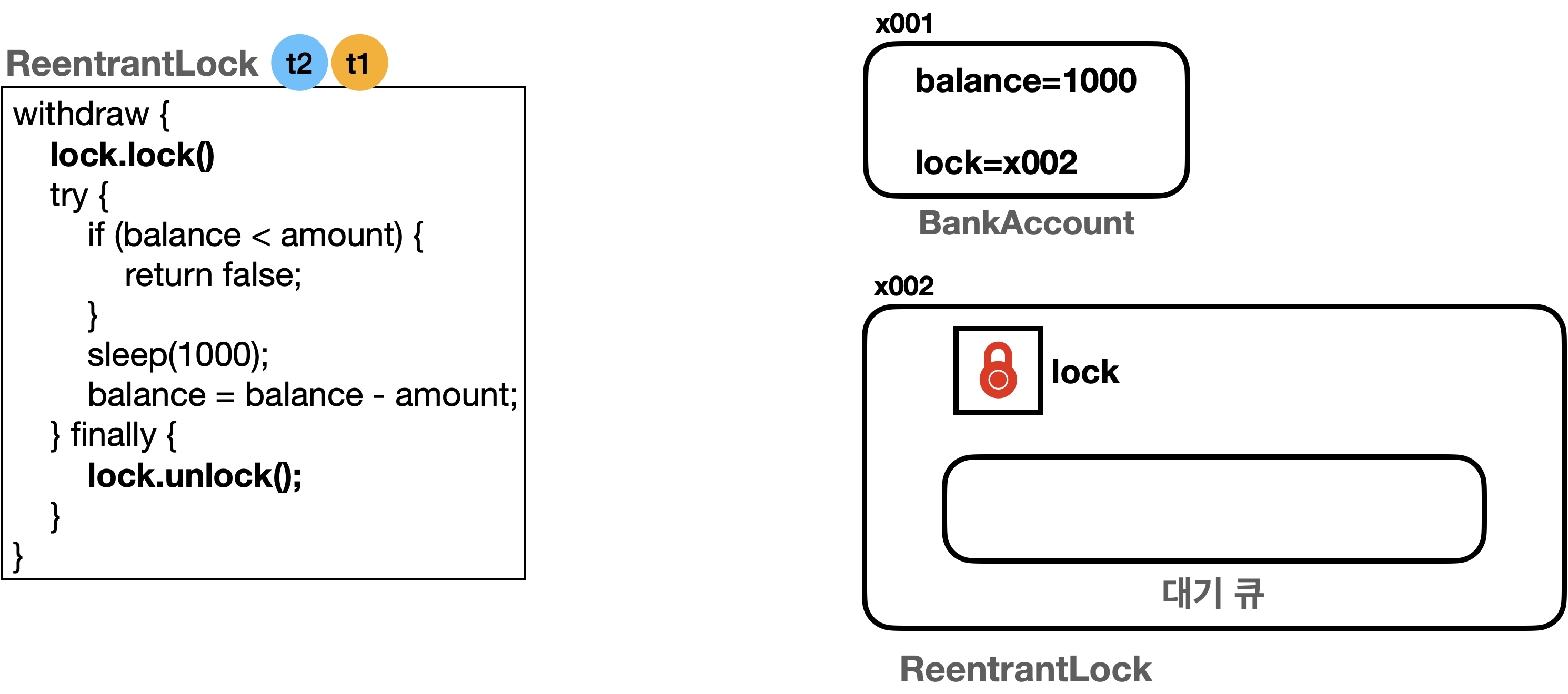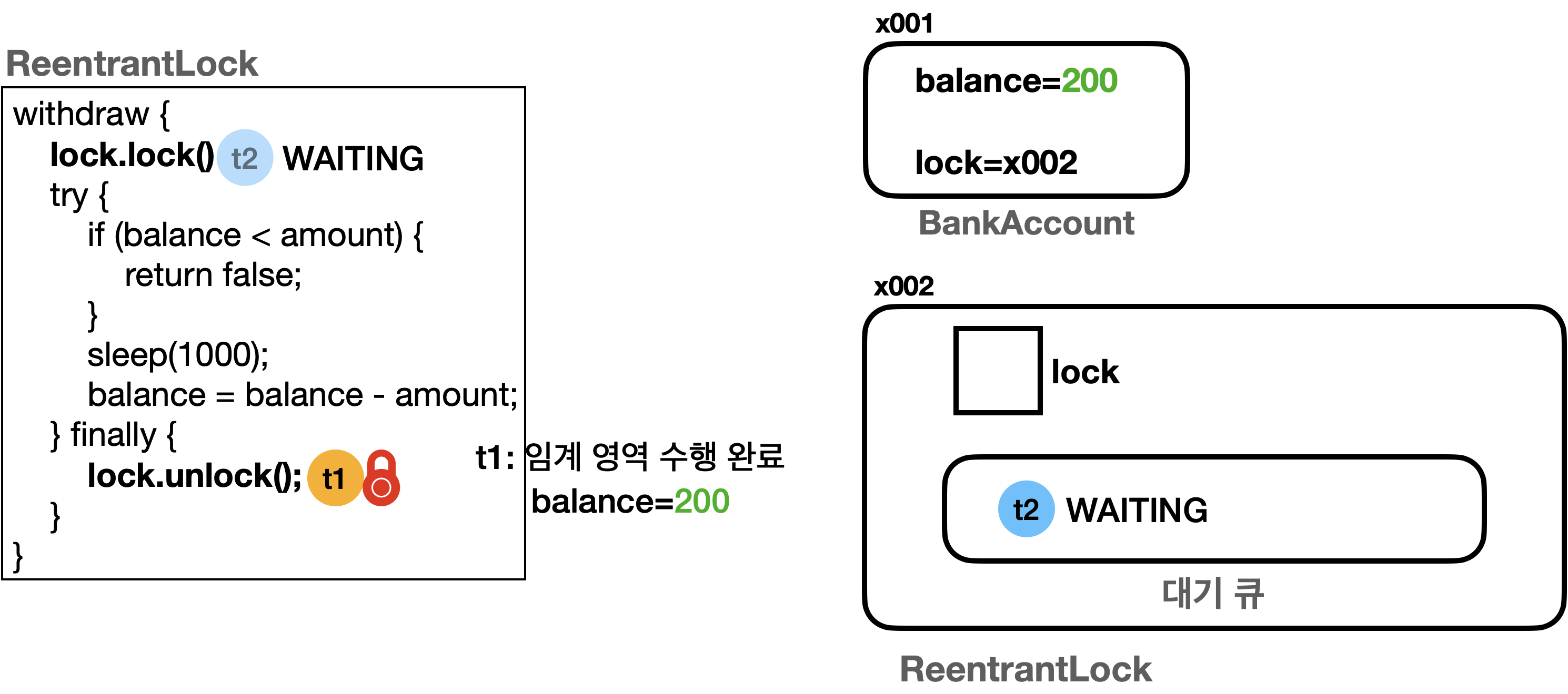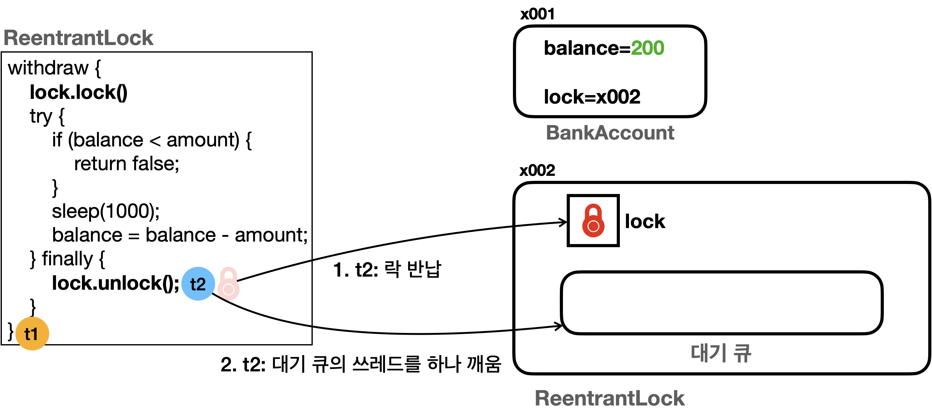 t1은 이제 락을 반납하고 대기큐에서 대기하던 t2가 락을 획득합니다.