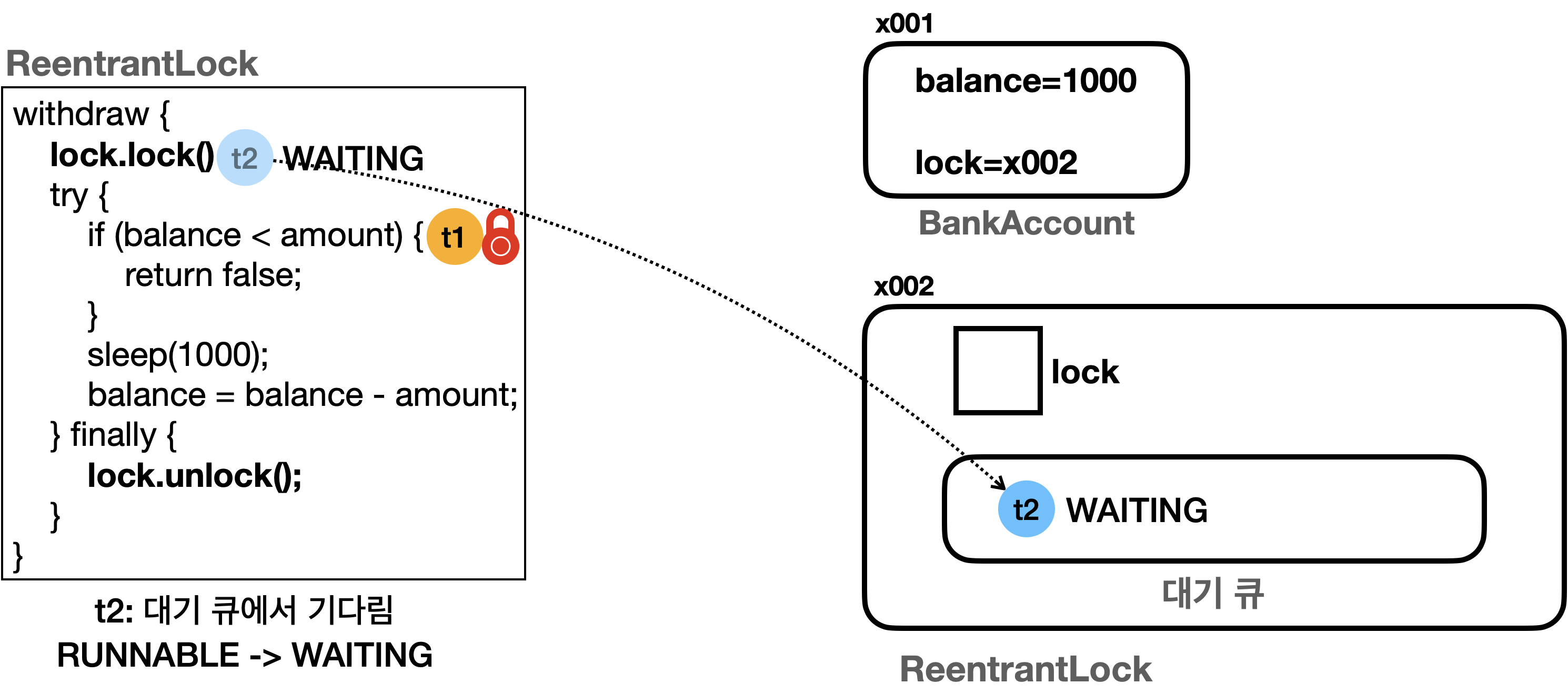 t2처럼 락을 획득하지 못하다면 대기큐에서 관리하게 됩니다.