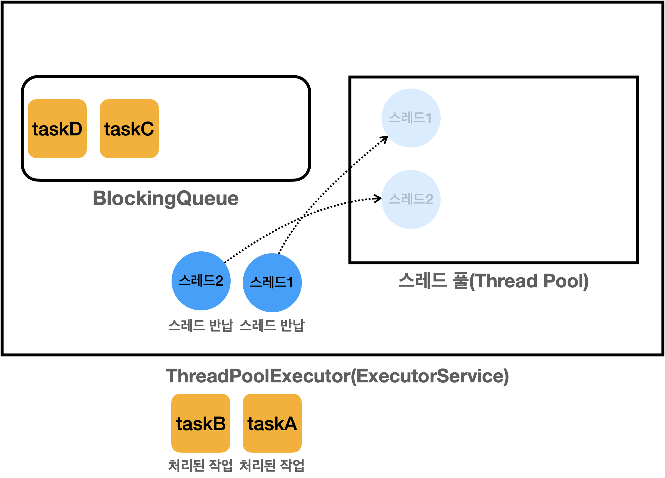 이제 스레드는 해당 작업들을 처리합니다 그림에서는 이해하기 쉽게 위해서 마치 풀에서 스레드를 꺼내서 작업하는것 같지만 실제로는 그저 풀안에서 상태만 변경된것입니다. Wating -> Runnable 로요